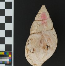 One turbinate, terrestrial snail shell. The coloration is white with light brown spotting. There are six whorls on the shell with vertical striations and tiny little dents throughout the shell. The shell is dextral with a "teardrop" shaped aperture. |