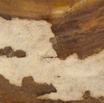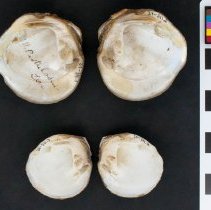 Four valves comprising two complete freshwater mussels. The shells are brown to tan in color, with a thick periostracum that is flaking near the umbos. The exteriors also have growth lines, striations, and large nodules covering the valves. The interiors have an iridescent, silver nacre, deep muscle scars and large hinge teeth. The shells are circular in shape. The two smaller shells have a grayish, moldy appearance. The shells have rounded posterior edges and slightly pointed anterior edges. |