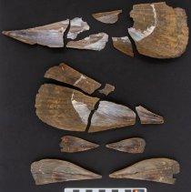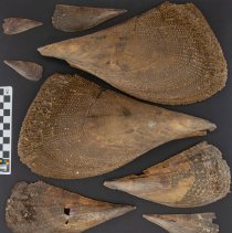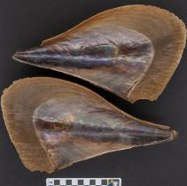 Eight saltwater clam valves. The exteriors are brown to tan in color. The shells have shallow ribs and are covered with spines, growth lines and a thin periostracum. The interiors are glossy and iridescent in appearance and tan to purple in color. The shells have very shallow muscle scars, no noticeable hinge teeth, and are translucent. The triangular shaped shells have pointed posterior edges and rounded anterior edges. |